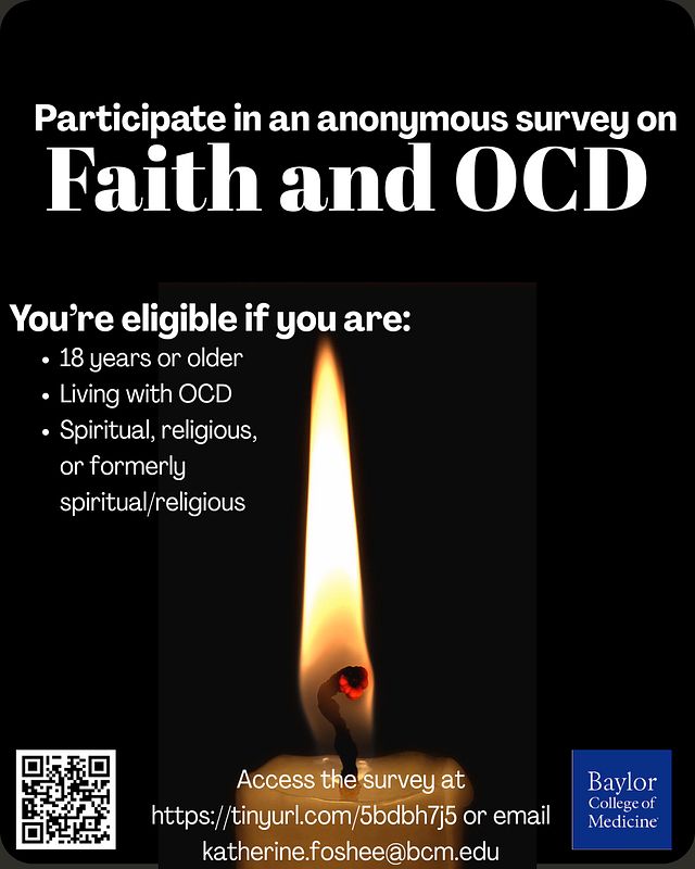 To participate in this anonymous survey about faith and OCD, go to https://bcmpsych.sjc1.qualtrics.com/jfe/form/SV_8CSV5XdwAxZynuS or email the study team at katherine.foshee@bcm.edu.