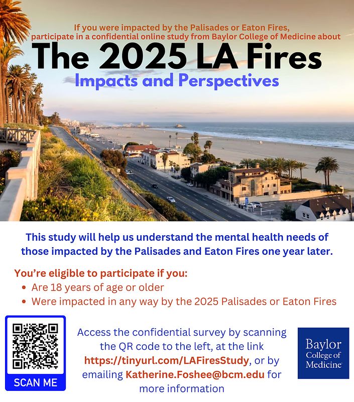 If so, you are eligible to complete an anonymous 20-30 minute survey about the mental health impact of the 2025 LA Fires. This important study is conducted by Dr. Caitlin Pinciotti at Baylor College of Medicine. The study is available to any person aged 18 years or older who feels that they were directly or indirectly impacted by the fires in any way. We are hoping to hear from people who experienced a range of impacts, so no impact is too little.