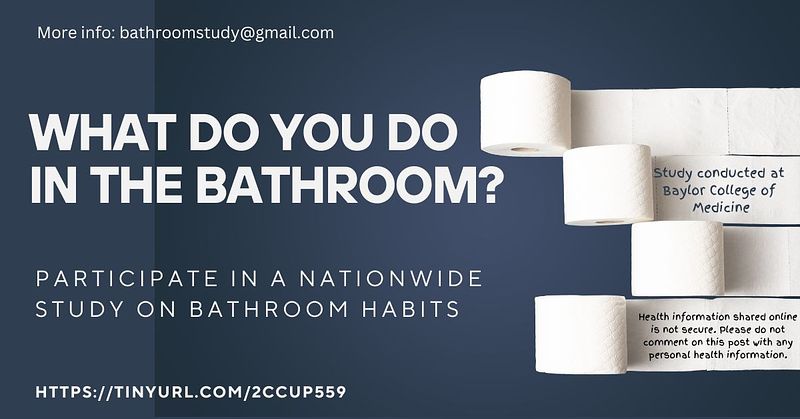 To participate in this anonymous survey about bathroom habits, go to  https://bcmpsych.sjc1.qualtrics.com/jfe/form/SV_0jjZeyvET8NRDro or email Bathroomstudy@gmail.com